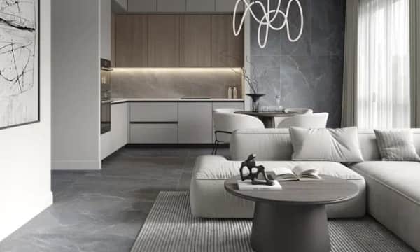 • Бежевый керамогранит на полу гостиной создаст ощущение простора.  Добавьте мягкий ковер, светлую мебель,  деревянные акценты – и вот вам стильная, расслабляющая атмосфера. В спальне это тоже работает, особенно в сочетании с пастельными тонами текстиля.