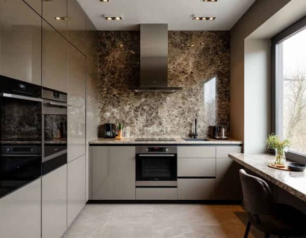 Если хочется акцентов — сделайте фартук контрастным, например, из керамогранита под камень с интересным рисунком.