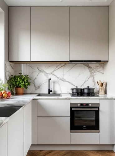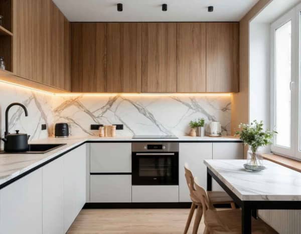 Представьте: светлая плитка с природной текстурой, минималистичная мебель, немного дерева — и вот уже ваша маленькая кухня выглядит как страница из интерьерного журнала.